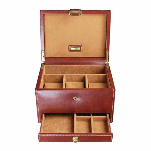 Classicly designed 3pc watch box in a Chestnut Brown premium Spanish bonded leather with a soft Tan suedette lining. This also has a deep storage section and a pull out drawer ideal storing your cufflinks and accessories.