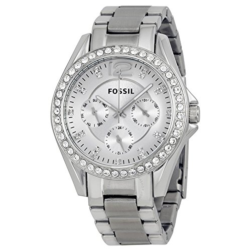 This ladies Fossil Riley watch is made from stainless steel and is powered by a quartz movement. It is fastened with a silver metal bracelet and has a silver dial. The watch has a date function.