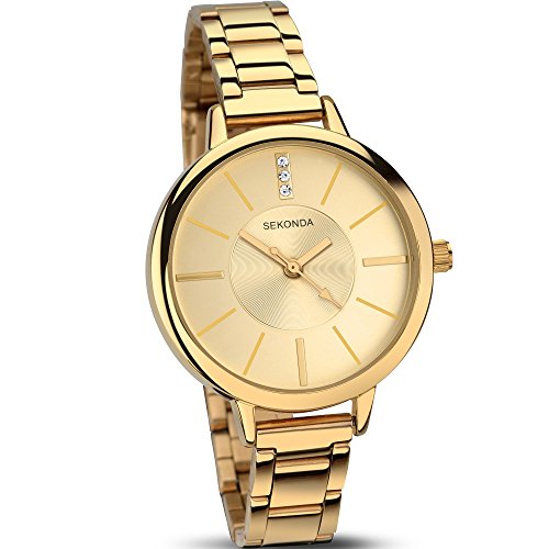 This classic ladies watch is brought to you from Sekonda. It features a round gold plated case and matching bracelet. The champagne coloured dial has gilt coloured batons and clear crystals to give a bright modern look. Scratch resistant glass. Model number 2180.27. Watch features: Scratch resistant glass. Champagne dial. Base metal case. Gold-coloured stainless steel bracelet. Push button clasp. Quartz movement. Analogue display. Manufacturer's 2 year guarantee.