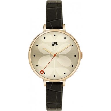 This ladies Orla Kiely Ivy watch has a PVD gold plated PVD gold plated case and is fitted with a quartz movement. It is fitted with a black leather strap and has a silver dial.