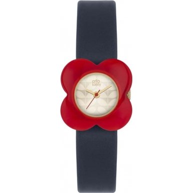 This ladies Orla Kiely Poppy watch has a stainless steel and resin case and is powered by a quartz movement. It fastens a blue rubber strap and has a silver dial.